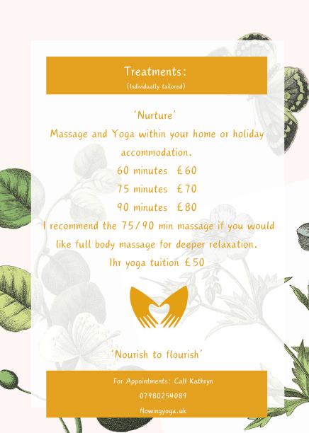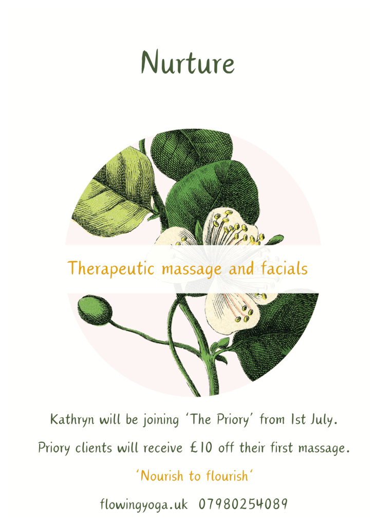 Kathryn will be offering therapeutic massage tailored to your needs( facials coming soon)from September at the Priory,. Bickland water road, Falmouth. TR114SN with plenty of parking. Kathryn will give £10 off as a introductory offer,until end of October.